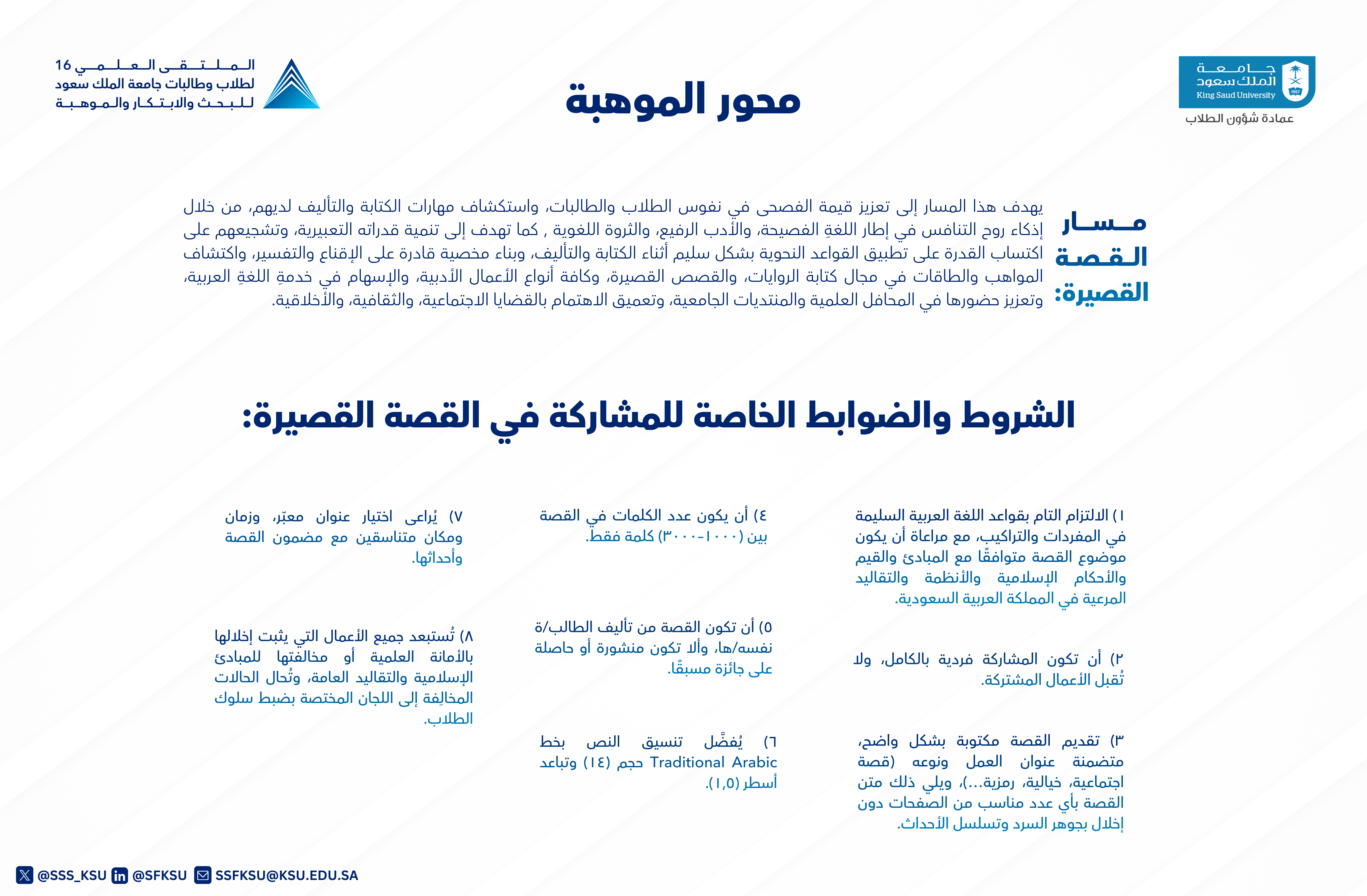 مسار القصة القصيرة رابط التسجيل في الملتقى العلمي 16 لطلاب وطالبات جامعة الملك سعود للبحث والابتكار والموهبة