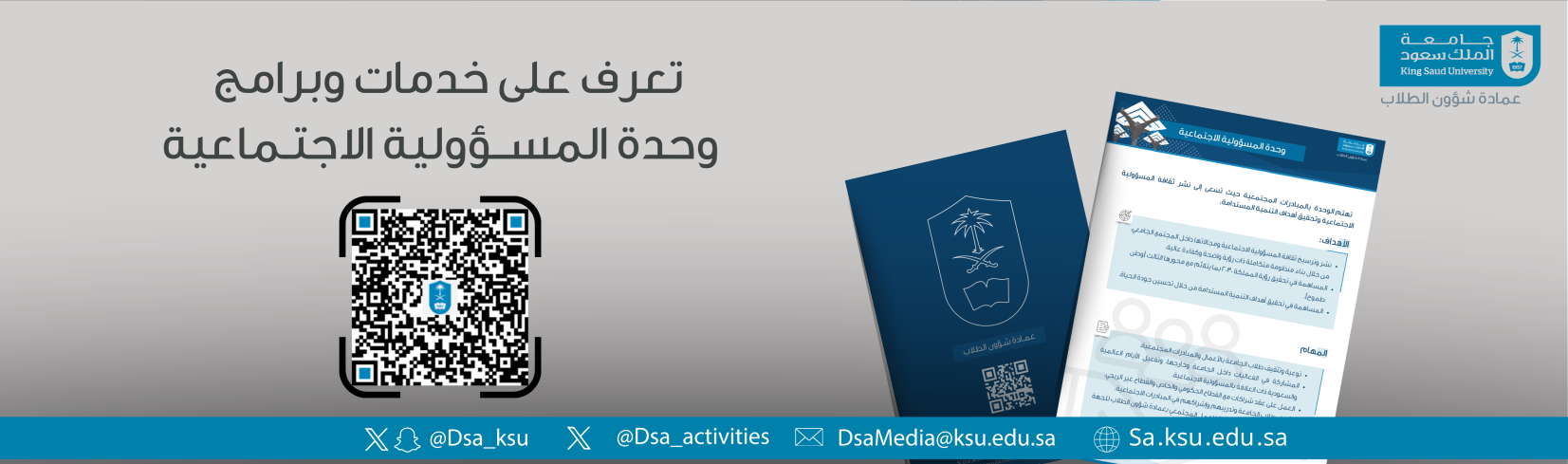 تُعنى وحدة المسؤولية الاجتماعية بجامعة الملك سعود بتفعيل الدور المجتمعي للجامعة عبر مبادرات وبرامج تسهم في تنمية المجتمع وخدمته، بما يعكس ريادة الجامعة وتاريخها في العطاء الوطني وتعمل الوحدة كحلقة وصل بين الجامعة واحتياجات المجتمع، من خلال التخطيط والتنفيذ والإشراف على مشروعات نوعية تُحقق أثرًا مستدامًا، وتدعم توجهات الجامعة في المشاركة الفاعلة بمسيرة التنمية الوطنية، بما يتوافق مع رؤية المملكة 2030.