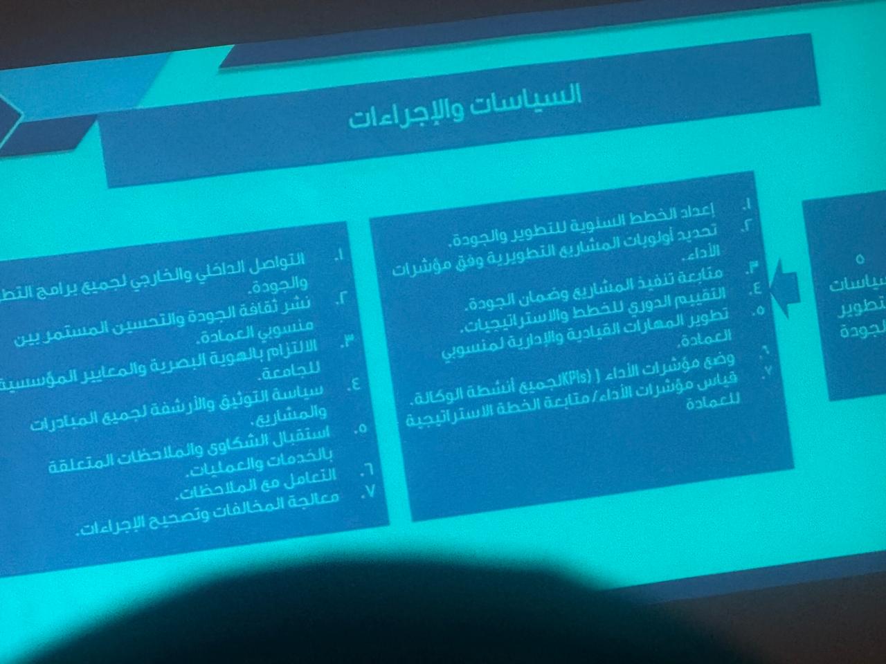 هدفت هذه الورشة إلى تمكين القيادات ومنسوبي العمادة من تطبيق منهجيات حديثة في إعداد السياسات والإجراءات، بما يسهم في توحيد الممارسات، ورفع كفاءة العمليات، وتحقيق مستويات أعلى من الجودة والامتثال المؤسسي. كما تناولت الورشة الأسس العلمية لبناء السياسات، وآليات صياغتها، وأهمية مواءمتها مع الأهداف الاستراتيجية، بما يدعم استدامة الأداء المؤسسي ويعزز ثقافة التميز،