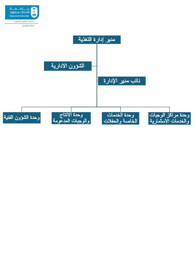 يُبيّن الهيكل التنظيمي لإدارة التغذية بعمادة شؤون الطلاب تسلسل المستويات الإدارية وتوزيع المهام بين الوحدات المختلفة، بما يضمن وضوح الأدوار وفعالية الأداء في تقديم خدمات التغذية داخل الجامعة.